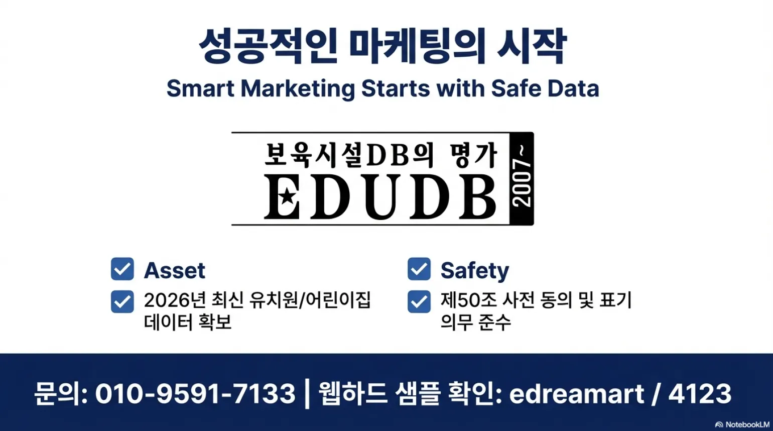 안녕하세요. 에듀디비(EduDB) 입니다. 2007년부터 전국 어린이집을 비롯한 보육시설 주소록을 수집 및 판매(전국 최저가)하고 있습니다. 보육시설 주소록이 필요하신 분들께서는 많은 이용 부탁드립니다.